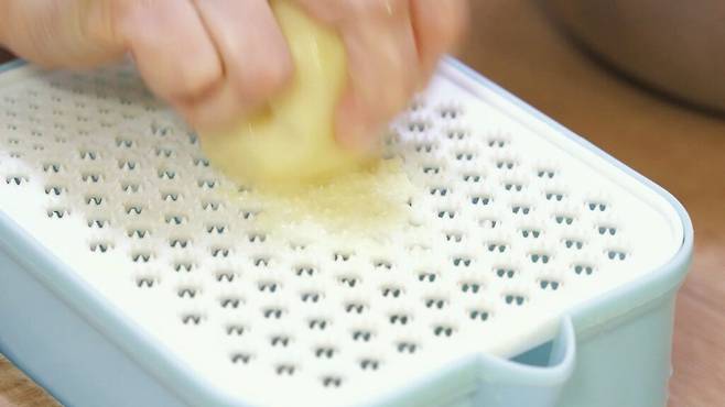 여기서 중요 포인트! 이제 중간 크기 양파 1/4개를 강판에 갈아주세요. 양파는 자연스러운 단맛과 감칠맛을 더하고 풍미를 풍성하게 해 준답니다. 또, 감자의 갈변을 늦춰 더욱 먹음직스러운 감자전을 만들 수 있어요.
