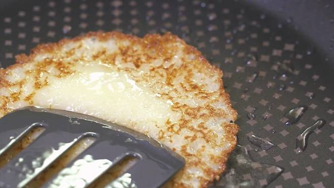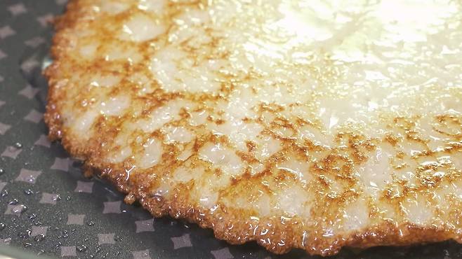 충분히 달궈진 프라이팬에 반죽을 한 국자 떠서 팬에 살짝 도톰하게 펴줍니다. 너무 얇으면 바삭하지만 속이 메말라요. 살짝 두툼하게 부쳐야 겉은 바삭, 속은 쫀득 맛있습니다.