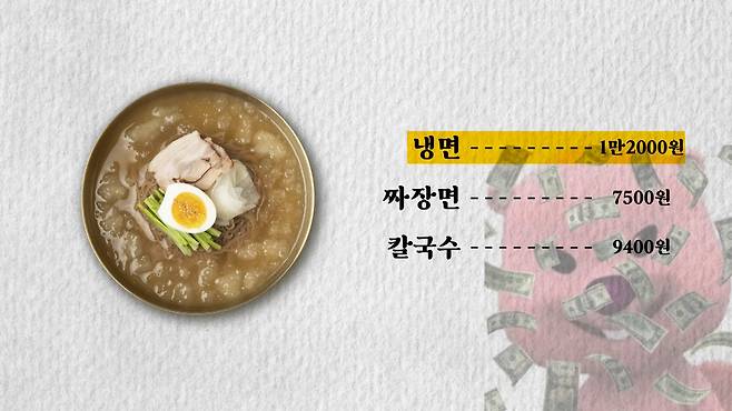 신기한게, 면요리 중에 유독 냉면만 이렇다. 한국소비자원 통계를 찾아 봤는데, 올해 서울 지역 냉면 1인분 평균 가격은 1만2000원 정도였다. 근데 짜장면은 7500원, 칼국수는 9400원 가량에 그쳤다. 냉면이 다른 면요리 보다 훨씬 비싼 것이다.