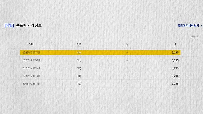 근데 농산물유통종합정보시스템을 확인해보니까 요새 메밀 중도매 가격은 1㎏당 3285원이다.1년 전보다 9% 가량 저렴한 거다.그러니까 면을 만드는 원자재 값이 뛰었다는 건 말이 좀 안된다.
