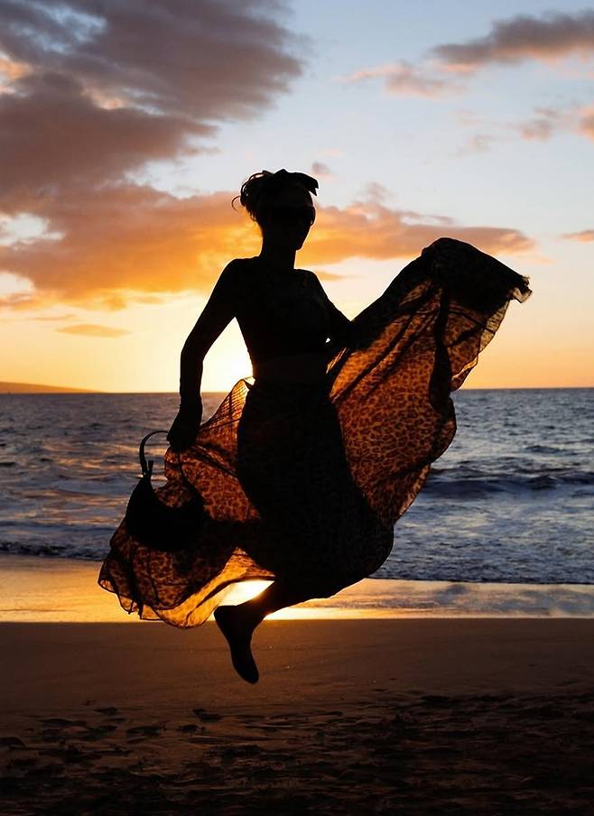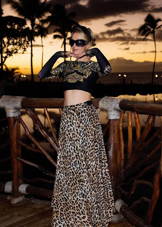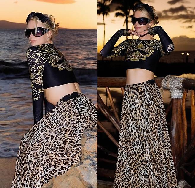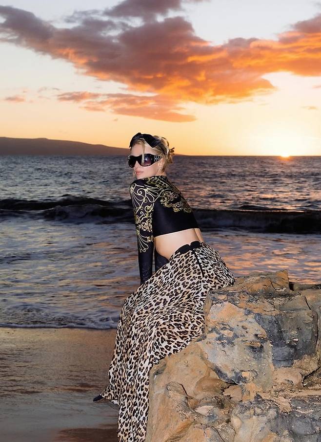 공개한 사진에서 패리스 힐튼은 복근이 드러난 금빛 디자인의 블랙 클롭 티셔츠에 호피 무늬 롱 스커트를 매치한 리조트룩으로 멋스러우면서도 슬림한 몸매를 드러냈다.