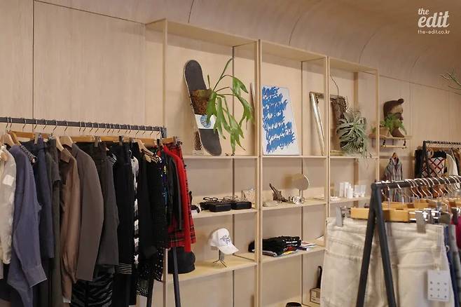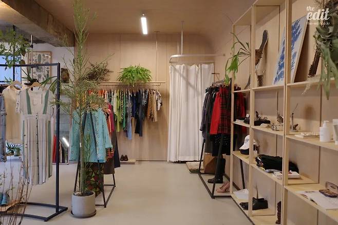 이곳은 이름 그대로 보노비스타와 보타가 함께하는 쇼룸이다. 온라인 스토어만 운영하던 시절을 포함해 15년간 해외 빈티지 의류를 취급해 온 보노비스타, 보노비스타의 형제 업체이자 조경 스타일링과 식물 리테일 판매를 담당하는 보타가 매장을 공유한다. 날마다 업데이트되는 50여 개의 빈티지 제품 중 엄선한 개체들만이 쇼룸에 들어오며, 진열된 의류 주변으로 다양한 종류의 식물들이 큼지막한 이파리를 뽐낸다. 방문 당시에는 여성 제품의 진열 비중이 높아 구매에는 실패했으나, 이색적인 공간 연출을 둘러보는 것만으로도 흡족한 경험이었다.
