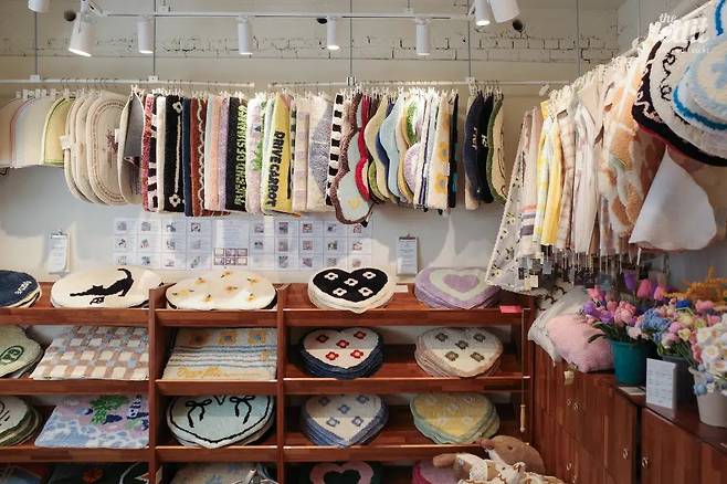 페이퍼가든 매장은 크게 패브릭, 플레이트, 플랜트 공간으로 구성된다. 브랜드의 주력 상품은 다양한 모양과 색감을 자랑하는 자체 제작 러그. 하트나 체크 같은 단순한 패턴부터 타이포그래피, 동물 캐릭터, 고전적인 느낌의 정물화까지 취향에 맞는 디자인 하나쯤은 발견할 수 있을 것이다. 주방 싱크대를 구현해 놓은 플레이트 섹션의 식기류나 맛과 비주얼 모두 만족스러운 와인을 고르는 재미도 놓치지 마시길. 귀엽고 아기자기한 아이템에 쉽게 마음을 빼앗기는 타입이라면 일단 한 번 가보셔도 좋겠다.