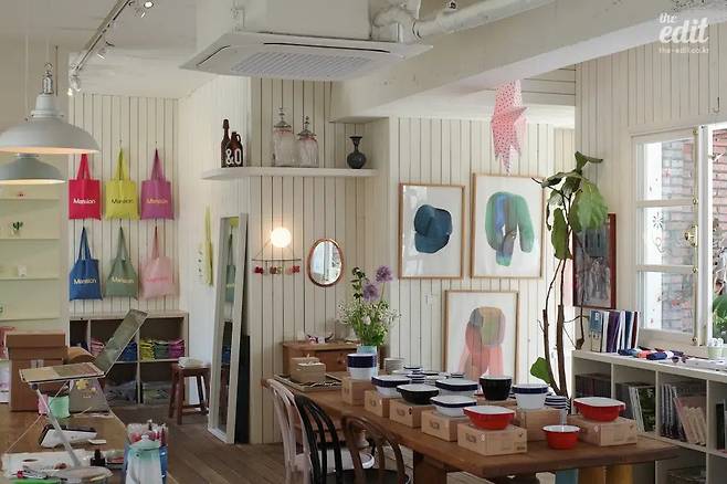 페이퍼가든 매장은 크게 패브릭, 플레이트, 플랜트 공간으로 구성된다. 브랜드의 주력 상품은 다양한 모양과 색감을 자랑하는 자체 제작 러그. 하트나 체크 같은 단순한 패턴부터 타이포그래피, 동물 캐릭터, 고전적인 느낌의 정물화까지 취향에 맞는 디자인 하나쯤은 발견할 수 있을 것이다. 주방 싱크대를 구현해 놓은 플레이트 섹션의 식기류나 맛과 비주얼 모두 만족스러운 와인을 고르는 재미도 놓치지 마시길. 귀엽고 아기자기한 아이템에 쉽게 마음을 빼앗기는 타입이라면 일단 한 번 가보셔도 좋겠다.