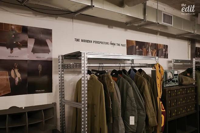 1950년대부터 1990년대를 아우르는 빈티지 아이템, 이를 올리언스 스토어의 색깔로 재해석한 리메이크 제품이 철제 행거를 가득 채운다. 50년대 쿠바(KUBA) 원단을 활용해 에스닉한 무드를 드러내는 MA-1 재킷, 60년대 미군 캔버스 더플백을 분해하고 재조합해 만든 탄탄한 숄더백, 70년대 페르시안 러그 조각을 수놓은 리바이스 501 데님 팬츠 등 특정 시대와 지역의 산물이 긴 세월을 거쳐 새로운 형태의 아이템으로 재탄생했다. 빈티지 문화에 매료된 이들과 유니크한 디자인의 옷을 찾는 이들 모두를 설레게 할 리워크 제품군. 오래된 옷과 직물의 매력을 느껴보고 싶다면 주저 말고 방문해 보자.