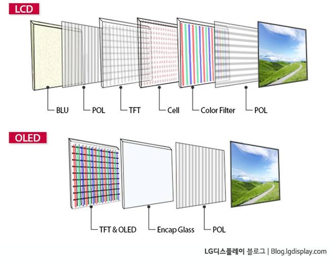 디자인과 사운드에 대해 말했지만, TV를 말할 때 가장 중요한 건 누가 뭐래도 ‘화질’이다. 다들 알겠지만 올레드는 LCD와 달리 백라이트가 없다. LCD TV는 백라이트 소자 하나하나를 끄는 게 안되기 때문에 검은색을 표현할 때도 백라이트는 켜져 있다. 이 때문에 검은색 화면에서도 뿌연 빛이 나온다. 반면 올레드 TV는 소자 하나하나가 빛을 내는 자발광 소자로 이루어져 있어서 검은색을 표현할 때 문자 그대로의 빛 하나 없는 새까만 검은색을 표현할 수 있다. LCD와 올레드의 결정적인 차이다.
