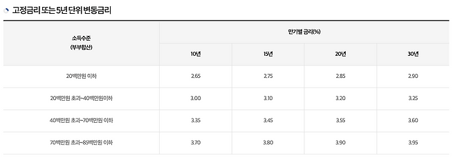무주택자가 5억 이하 집을 살 때 최대 2.5억까지 대출해 주는데요(뭐 거의 반이네요), 금리가 혜자예요. 부부 합산 연봉이 2천만원 이하면 최저 2.65%가 적용돼요. 연봉 기준이 살벌하네요🤐.