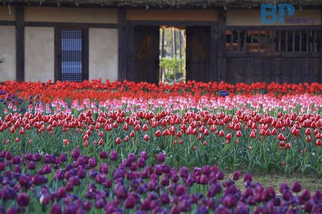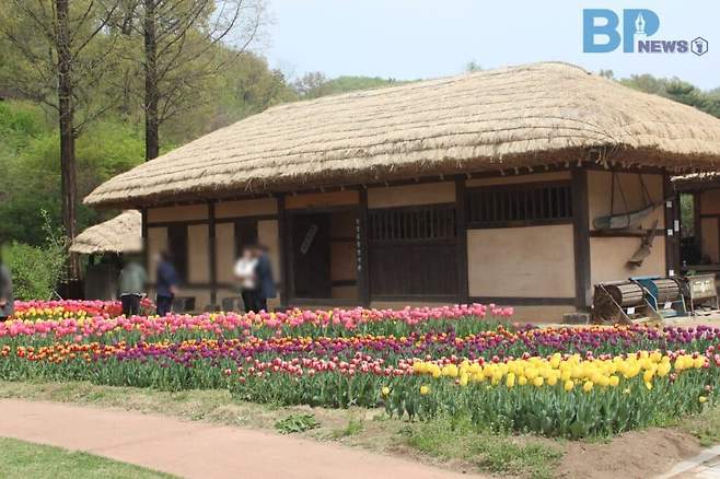 운치 있는 옛날 초가집 건축물 앞에 활짝 핀 튤립은 이질적이면서도 오묘한 조화를 이룬다.