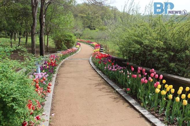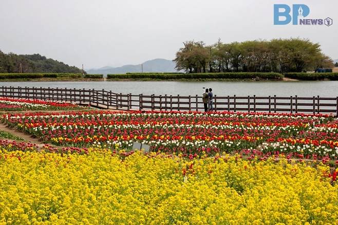 봄에는 벚꽃 나무가 피어나 장관을 이루지만, 벚꽃이 진 후로는 노란 유채꽃과 다채로운 튤립들이 저수지 인근을 채워준다.