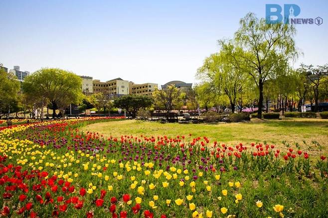 알록달록한 튤립 카펫은 귀엽고 사랑스러운 느낌을 주어 SNS에 업로드할 인증샷을 찍기 좋은 포토스팟이 된다.