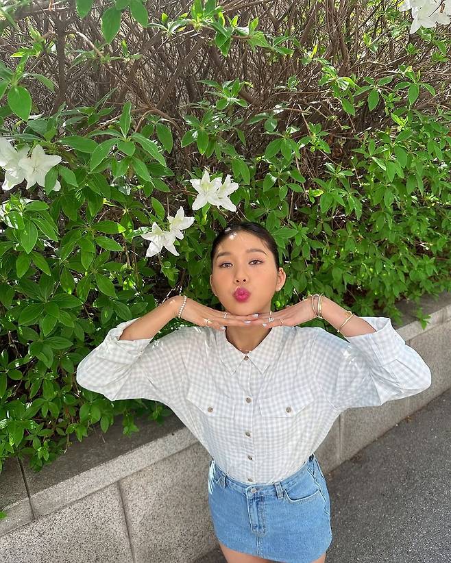 사진 속 미미는 체크 패턴이 은은하게 들어간 화이트 셔츠에 데님 미니스커트를 매치해 산뜻한 룩을 완성했다. 셔츠는 루즈하게 착용해 자연스러운 핏을 살리고, 하의는 하이웨이스트 디자인의 데님 미니스커트를 선택해 다리 라인이 더욱 길어 보이게 연출했다. 여기에 발목까지 오는 화이트 삭스와 클래식한 로퍼를 매치해 깔끔하면서도 소녀미 넘치는 스타일링을 완성했다.