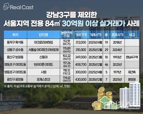 부동산시장 분석업체 부동산인포가 아실 최고가 순위 분석 데이터를 통해 2020년부터 최근까지 서울 전용 84㎡ 거래를 확인한 결과, 비강남 지역에서 실거래가 30억 원 돌파 사례는 6건으로 확인됐으며 모두 올해 2~4월 사이에 등장했습니다.