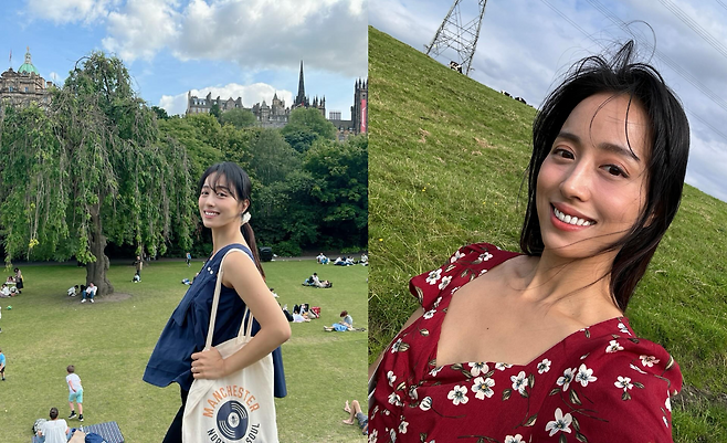 네이비 민소매 톱과 베이지 에코백의 조합으로 깔끔한 파크 룩을 연출하고 있다. 단정한 네이비 컬러가 지적이고 세련된 이미지를 만들어내며, 에든버러의 아름다운 풍경과 조화를 이루고 있다. 심플하면서도 품격 있는 스타일링이 돋보인다.