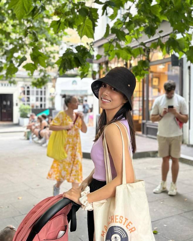 임현주는 보라색 니트 탑과 검은색 하의를 매치하여 세련된 도시적 감각을 연출하고 있다. 검은색 버킷햇으로 포인트를 주며, 베이지색 에코백을 활용해 친환경적이면서도 실용적인 스타일링을 완성했다. 유모차를 끌고 있는 일상적인 모습에서도 깔끔한 패션 센스를 보여주고 있다.