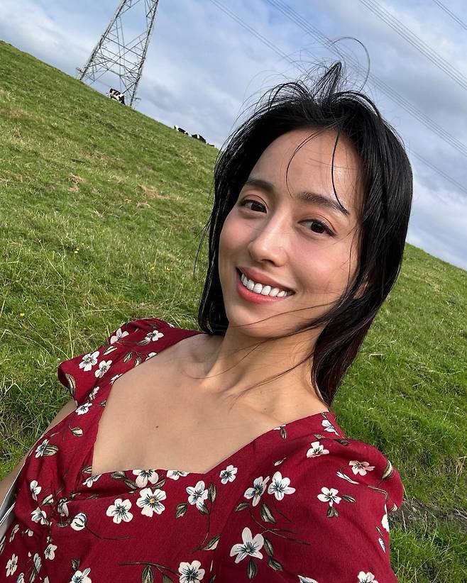와인색 플로럴 원피스로 로맨틱한 분위기를 연출하고 있다. 스퀘어 네크라인의 디자인이 여성스러움을 강조하며, 작은 꽃무늬 패턴이 봄날의 싱그러움을 표현한다. 야외에서의 자연스러운 미소와 함께 편안하면서도 우아한 스타일을 완성하고 있다.