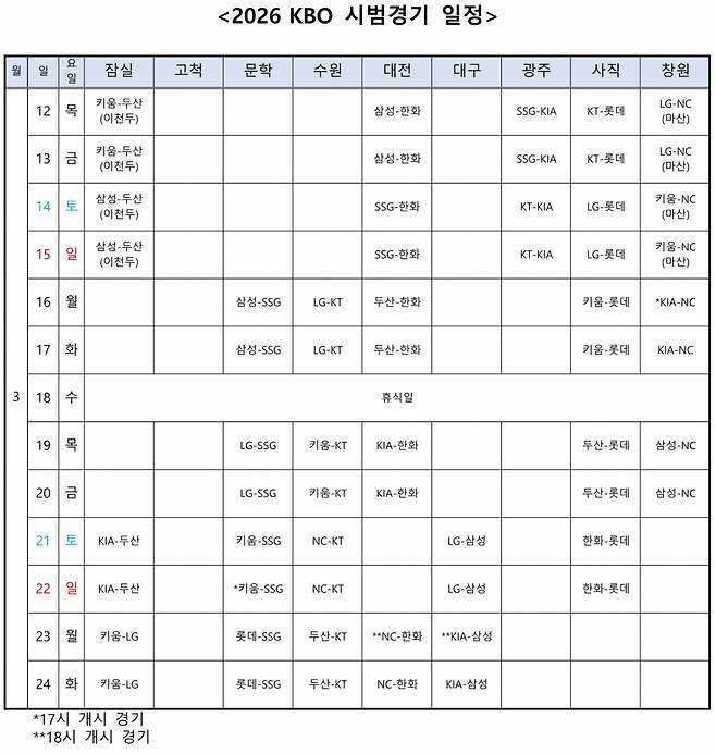 KBO는 12일 오후 1시 이천(키움-두산), 대전(삼성-한화), 광주(SSG-KIA), 사직(KT-롯데), 창원(LG-NC) 등 5개 구장에서 시범경기 개막전을 치른다고 밝혔다.