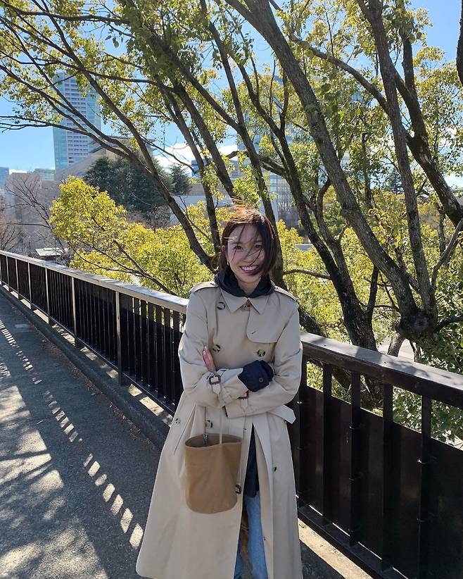 첫 번째 사진에서는 베이지 트렌치코트를 활용해 클래식하면서도 우아한 분위기를 연출했다. 자연스럽게 흐르는 실루엣과 뉴트럴 톤의 버킷백이 조화를 이루며, 청바지와 함께 캐주얼한 요소를 더했다. 바람에 흩날리는 머리카락과 함께 계절감을 잘 살린 스타일링이 돋보인다.