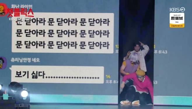 '챗플릭스'에선 '케이팝 데몬 헌터스'를 패러디, 송준근, 박성광, 이상훈이 보이그룹 사자보이즈로 등장했다. 세 사람이 등장하자마자 채팅에선 '문 닫아라'란 요구가 빗발쳤다. 박성광이 "우린 사자보이즈"라고 소개하자 채팅에선 '하자보이즈', '넷플릭스 코리아다. 고소하겠다'라며 야유가 쏟아졌다. 이어 사자 보이즈가 '소다팝'을 추려고 하자 '쏟은 밥', 'X팝' 등 채팅이 이어졌다.