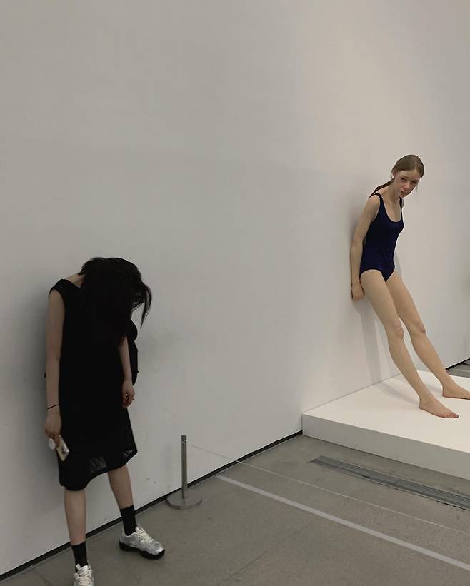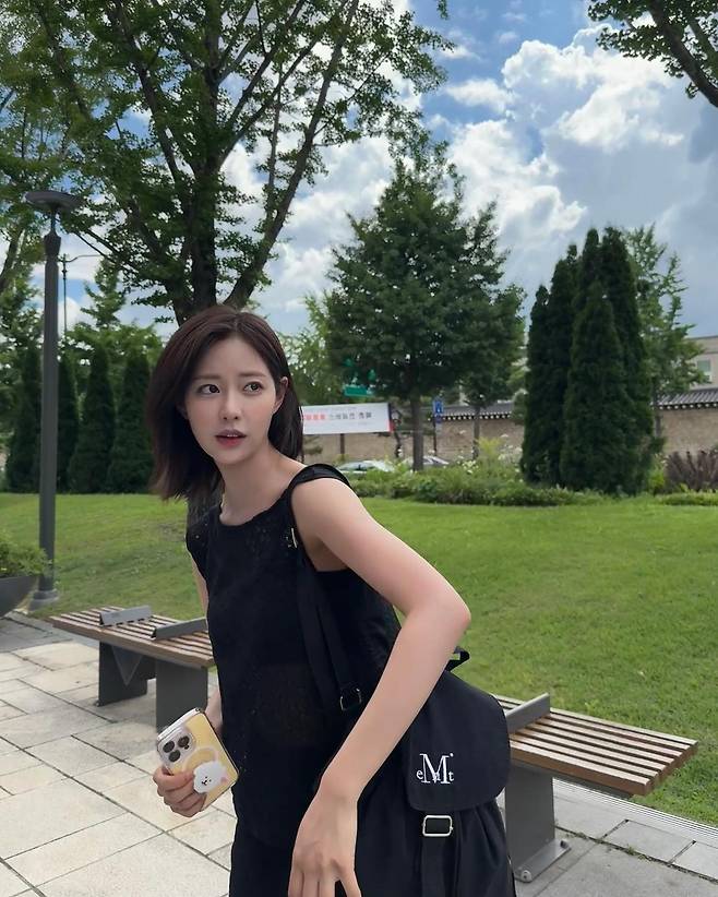 살짝 젖은 듯한 질감의 블랙 시스루 니트 톱과 스커트 셋업은 여름 햇살 아래서 더욱 은은하게 빛났고, 백팩 하나 툭 걸친 캐주얼한 조합은 무심한 듯 세련됐어요.