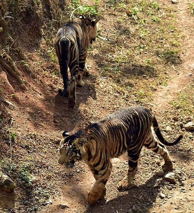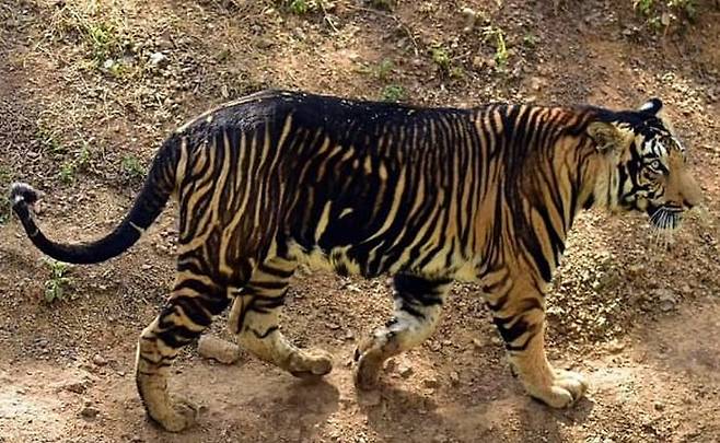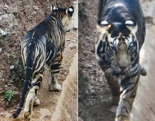 인도 오디샤주 동부의 심리팔 보호구역과 난단카난 보호구역에서 포착된 검은 호랑이는 실제 줄무늬가 촘촘하게 새겨져 있었고 주황색 털은 거의 보이지 않았죠.