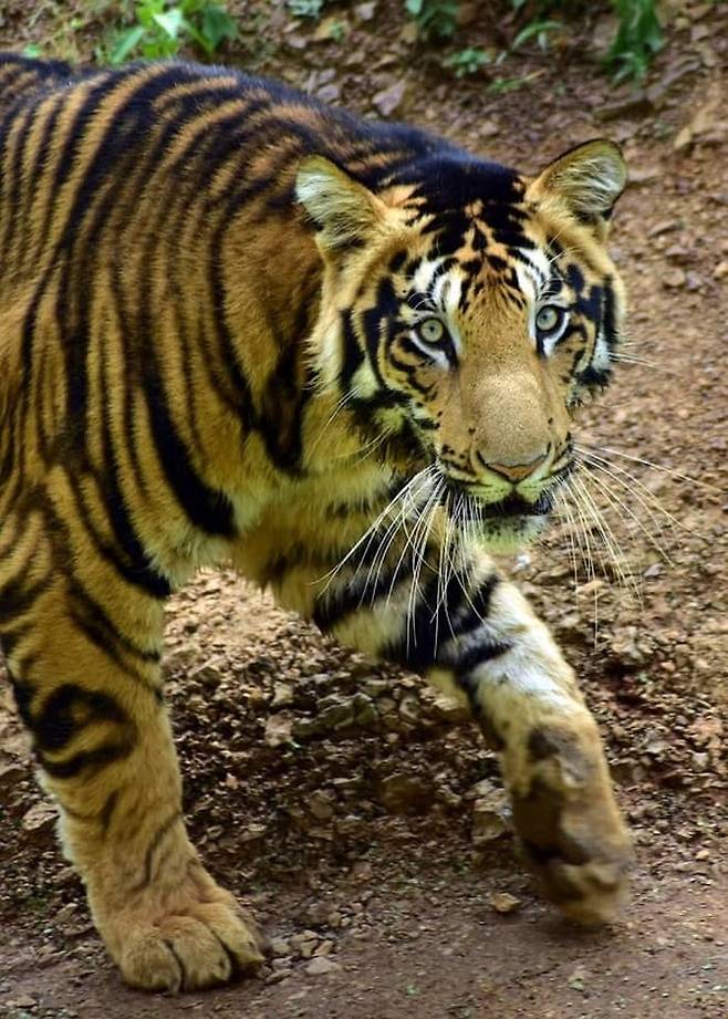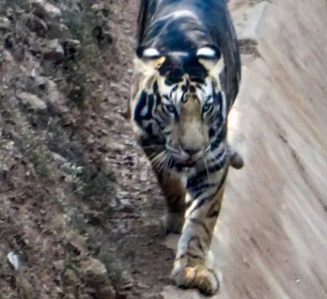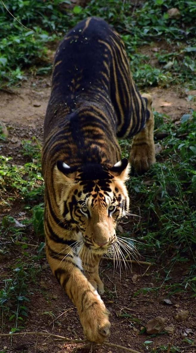 뉴델리 출신 경영학과 학생이자 아마추어 사진작가 사티아 스와가트(Satya Swagat)가 포착한 검은 호랑이는 상대적으로 주황색 털이 더 많이 보이기도 하는 모습을 보이기도 했습니다.