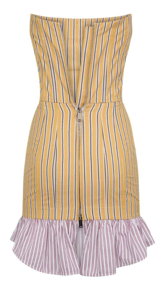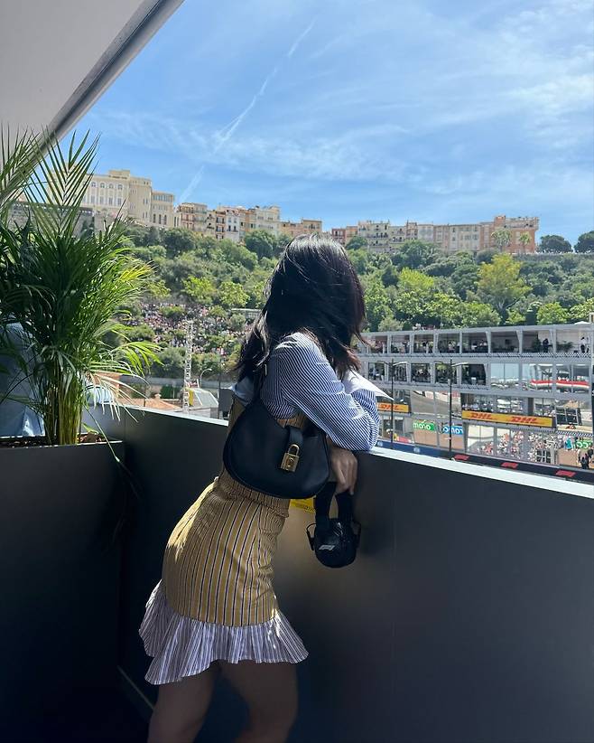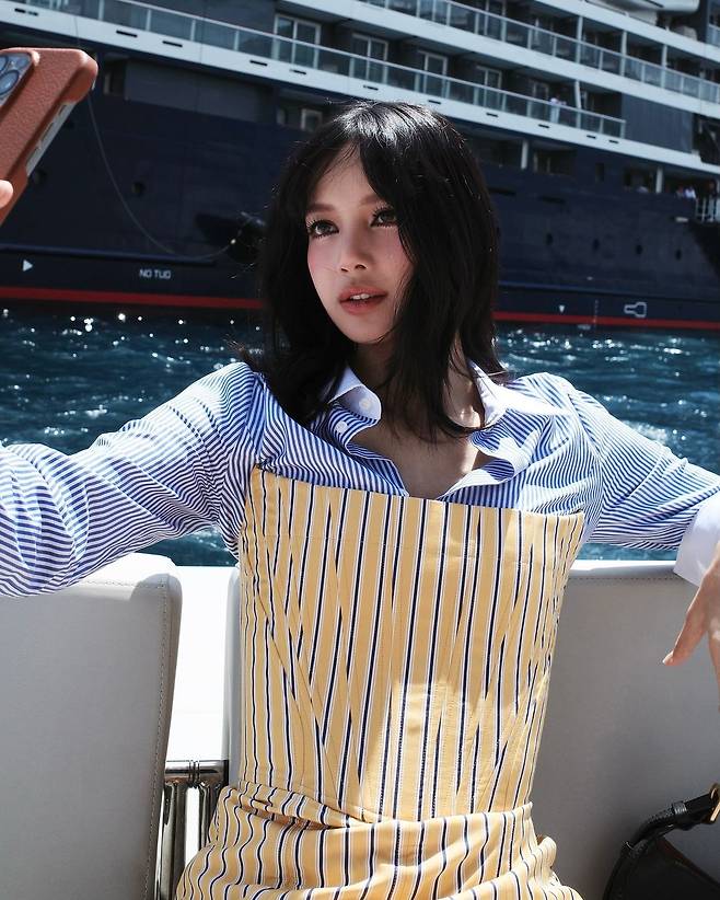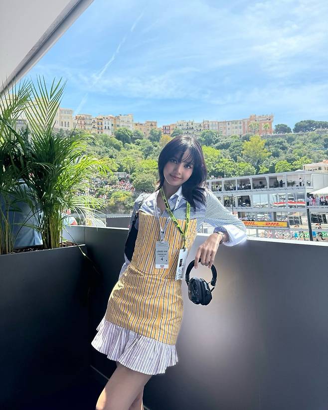 사진 속 리사는 하늘색 스트라이프 셔츠를 이너로 입고 밑단에 흰색 프릴이 있는 노란 스트라이프 탑원피스를 입어 러블리함을 한껏 강조했다.