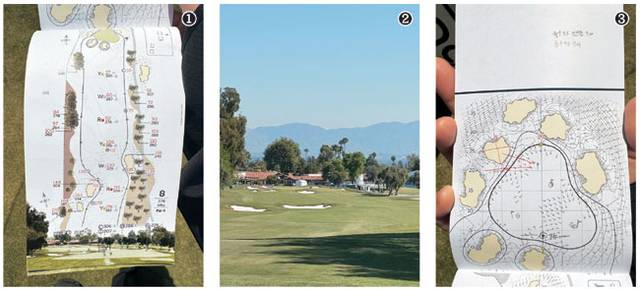골프대회의 TV 중계를 보다 보면 경기하던 프로골퍼가 야디지북을 확인하는 모습을 볼 수 있다. 야디지북(사진 ①)은 코스의 구성 등 주요 정보를 담은 소형 책자다. 프로골퍼가 야디지북을 활용하는 것은 경기 전략을 짜고 코스를 공략하기 위해 매우 중요하기 때문이다.