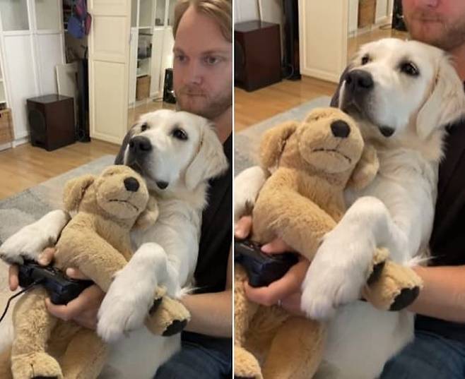 이날 아빠는 컴퓨터 게임을 하는 도중에 인형을 껴안은 상태로 자신의 옆을 서성 거리는 강아지가 눈에 밟혀 무릎에 올려놓았다고 합니다.