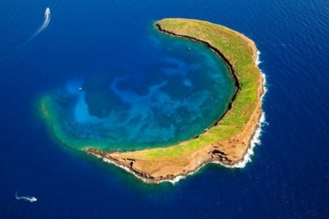 마우이 섬에는 스노클링을 즐기기 위한 장소가 몇 군데 있지만 그중에서도 가장 유명한 곳이 바로 '몰로키니' 라는 곳입니다. 몰로키니는 바닷속 용암벽이 파도를 막아줘서 열대어들이 서식할 수 있는 최적의 환경인데요. 그래서 스노쿨링으로 많은 물고기들을 관찰할 수 있는 마우이섬의 핫 스팟으로 꼽힙니다. 오랜 파도의 영향으로 마치 초승달과 같은 모양을 하고 있는 몰로키니 섬입니다.