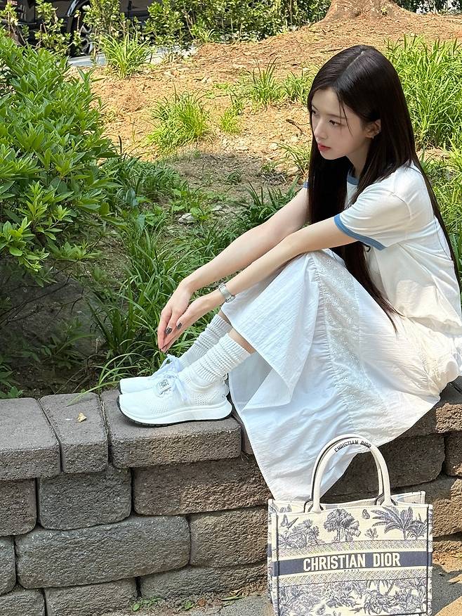 하얀 티셔츠에 잔잔한 블루 포인트가 더해진 니트 톱은 단정하면서도 사랑스럽고, 살짝 퍼지는 실루엣의 화이트 스커트는 소녀 같은 감성을 그대로 담고 있어요.