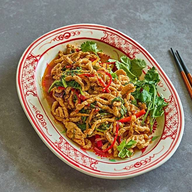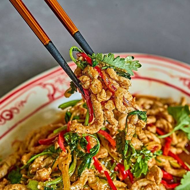 ‘향라육슬(香辣肉丝)’은 돼지고기를 이용한 정통 중식 요리입니다. 고기를 센불에서 빠르게 볶아내 불향을 입히고, 고추기름과 두반장으로 매콤한 맛을 살리는데요.