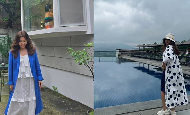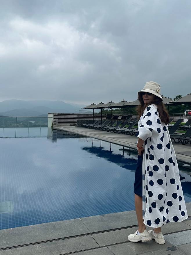 수영장가에서 포착된 최명길은 네이비 폴카닷 패턴의 가운 스타일 원피스로 리조트 룩을 완성했다. 흰 바탕에 크고 작은 도트가 산재한 디자인은 클래식하면서도 모던한 매력을 발산하며, 버킷햇과 화이트 스니커즈로 캐주얼한 포인트를 더해 편안한 휴양지 스타일을 연출하고 있다.
