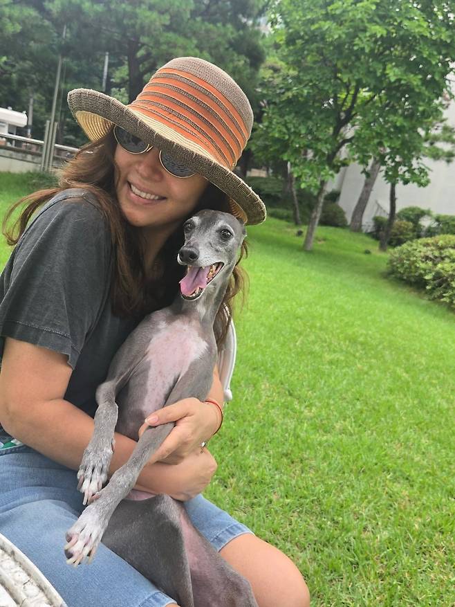 반려견과 함께한 일상 속 최명길은 그레이 티셔츠에 오렌지 포인트가 들어간 스트로 햇을 매치해 친근하고 자연스러운 모습을 연출하고 있다. 선글라스까지 더한 이 캐주얼 룩은 편안함 속에서도 스타일리시함을 놓치지 않는 그녀만의 패션 센스를 드러내고 있다.