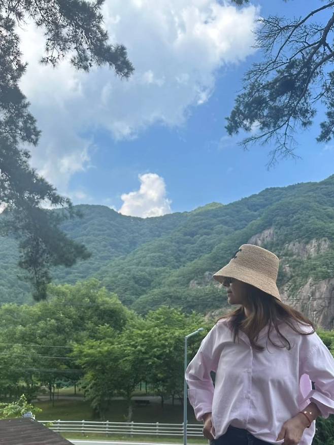 자연 배경에서 촬영된 모습에서 최명길은 연한 라벤더 컬러의 오버사이즈 셔츠를 착용해 편안하면서도 세련된 룩을 선보이고 있다. 스트로 햇과 함께 매치한 이 스타일링은 자연스러운 실루엣과 부드러운 컬러감으로 여유로운 일상복의 진수를 보여주고 있다.
