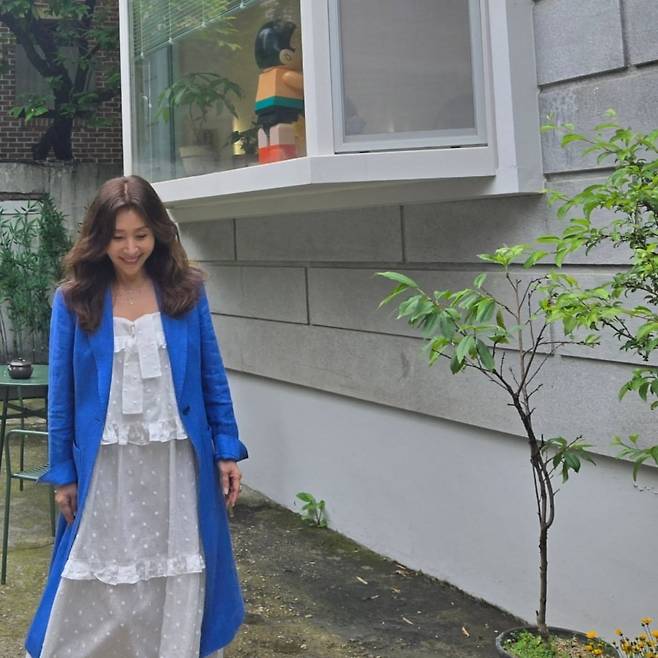 최명길은 순백의 플로럴 드레스 위에 선명한 코발트 블루 롱코트를 매치해 세련된 레이어드 룩을 연출하고 있다. 흰색 드레스는 로맨틱한 플로럴 패턴과 페미닌한 실루엣으로 봄날의 싱그러움을 표현했으며, 그 위에 착용한 긴 블루 코트는 모던하면서도 우아한 분위기를 더하고 있다.