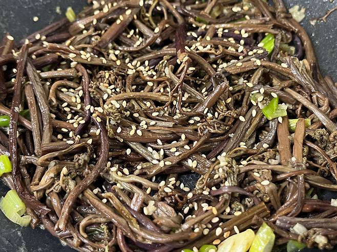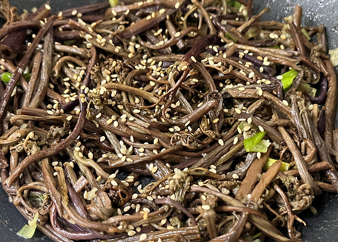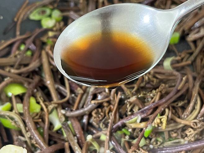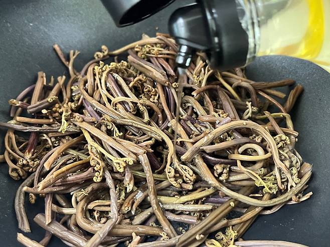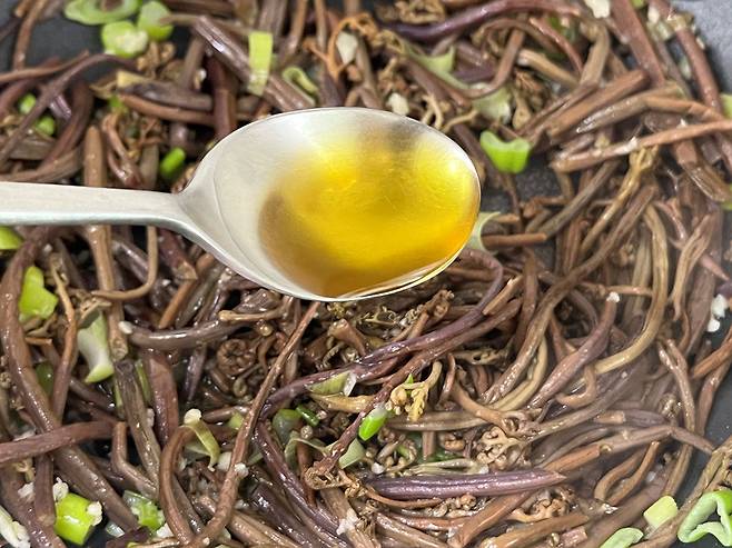 고소한 들기름도 1스푼 넣어 주세요. 들기름은 고사리 특유의 흙내와 쓴맛을 잡아주고 고소한 향으로 전체 맛을 끌어올립니다.