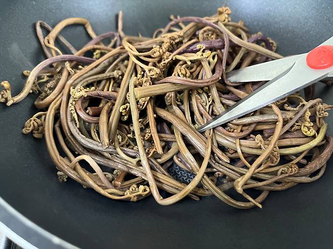 고사리는 식용유를 넣고 약불에 달달 볶아 주세요. 기름에 볶으면 고사리 질감이 더 부드러워지고 감칠맛이 극대화됩니다.
