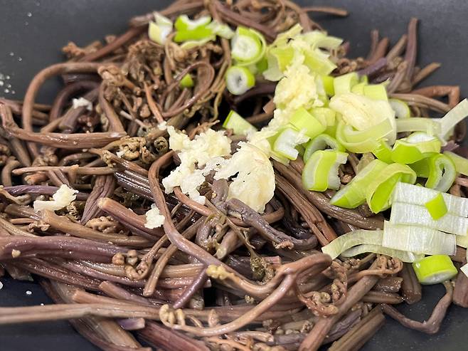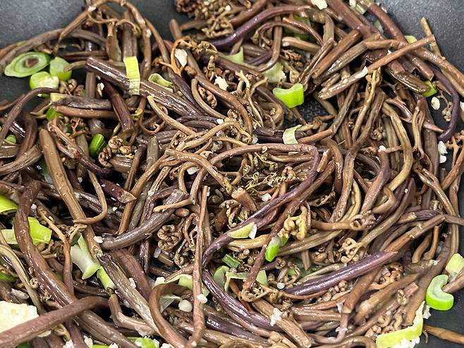 다진 마늘, 다진 대파를 넣고 함께 볶으세요. 마늘과 파를 넣고 함께 볶으면 고사리 특유의 비린내도 잡을 수 있습니다.