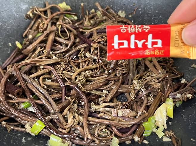 약간 부족한 맛을 채워주는 것, 바로 다시다인데요. 고사리에 다시다 아주 소량 2~3꼬집만 넣어 주세요. 그럼 감칠맛과 풍미가 더욱 좋아집니다.