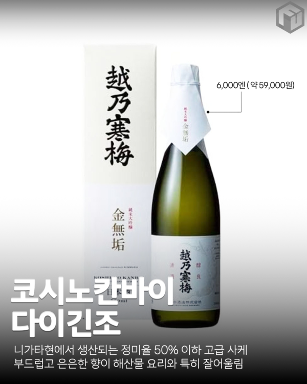 니가타현에서 생산되는 고급 사케 코시노칸바이 다이긴조입니다. 정미율 50% 이하로 정교하게 깍아내어 부드럽고 은은한 향이 특징인데요. 특히 해산물 요리와 잘 어울려 애호가들이 많은 사케라고 합니다.