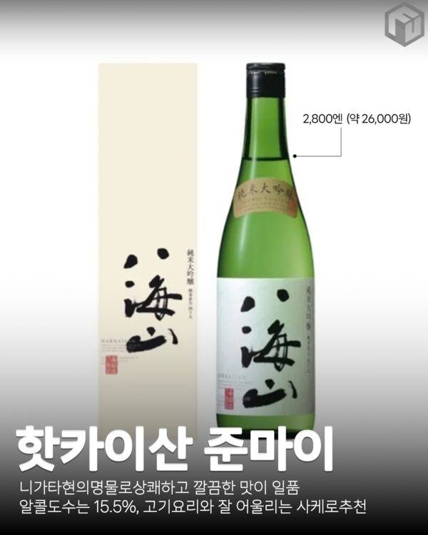 니가타현의 명물로 상쾌하고 깔끔한 맛이 특징인 핫카이산 준마이 사케입니다. 알코올 도수는 약 15.5%로 높지만 부드럽고 깔끔한 맛이 특징입니다.
