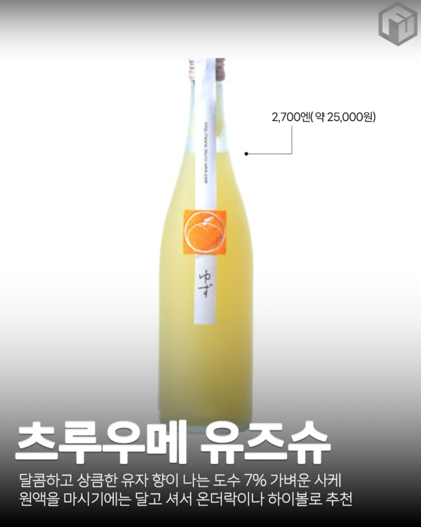 달콤하고 상큼한 유자 향이 나는 사케 츠루우메 유즈슈입니다. 츠루우메 유즈슈는 알코올 도수 7%로 비교적 도수가 낮아 술을 잘 못 마시는 분들도 부담 없이 즐길 수 있습니다.