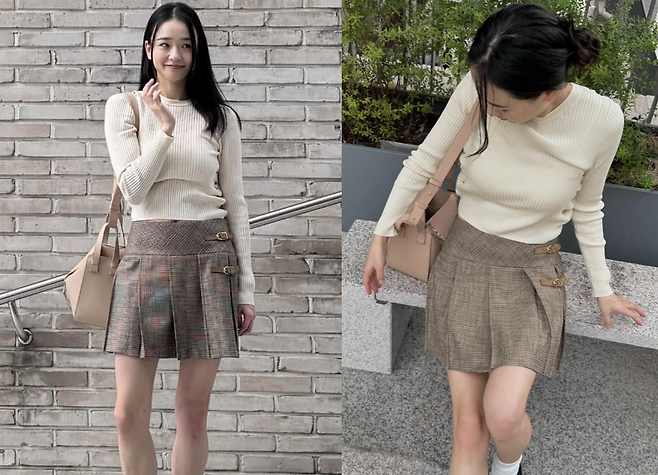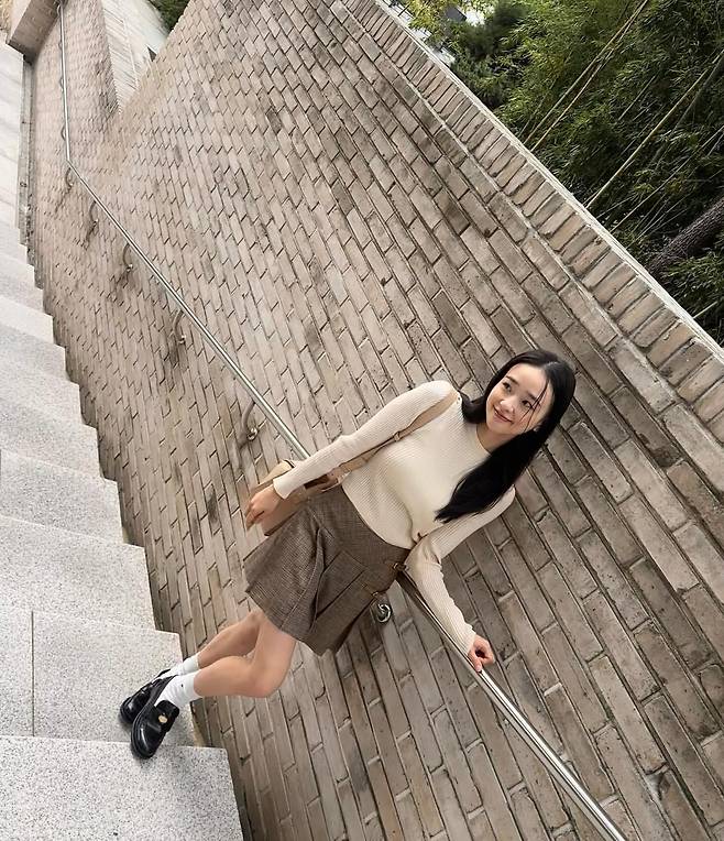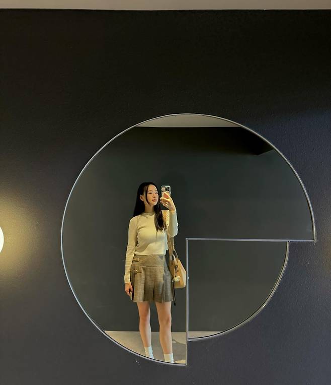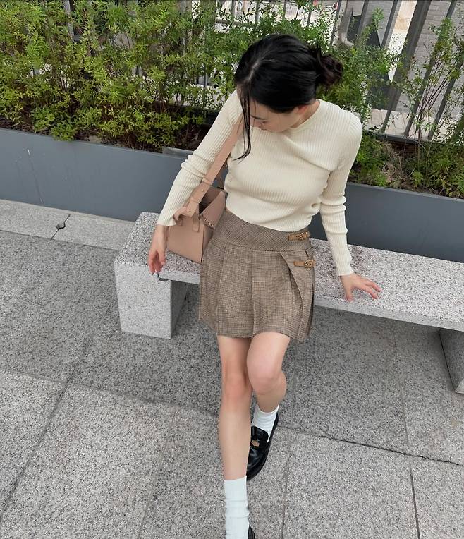 사진 속 손연재는 아이보리니트에 미니스커트와 로퍼를 매치한 소녀 패션을 선보였습니다.