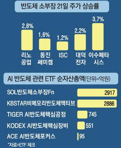또 이날 하루에만 2개의 AI 반도체가 동시 상장되며 하루 만에 1000억원이 넘는 자금이 유입돼 주가를 지지할 것으로 전망된다. 작년말 반도체 ETF 규모는 5000억원 수준이었는데 최근엔 자산규모는 2조2000억원으로 늘어났다.