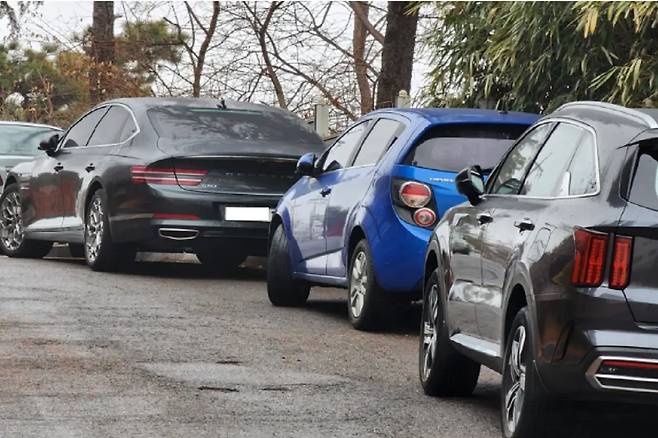 그렇다면 아래 사진에서 중간에 차주의 인성이 아주 기대되는 파란색 차량 말고 나머지 차량들은 신고하면 다 범칙금 대상이 되는 겁니다. 아래 사진만으로 8만원을 땡길(?) 수 있는 것이죠. 아, 혹시나 오해하실까봐 말씀드리는데 신고자한테 포상은 없습니다. 세수확보에만 해당됩니다.