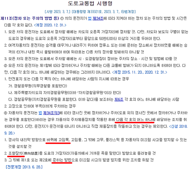 도로교통법 시행령 제11조 정차 또는 주차의 방법 등의 3항을 보면 주차제동장치, 그러니까 사이드 브레이크를 작동시킨 상태에서 아래의 3가지 방법 중 하나는 꼭 하라는 것이죠.