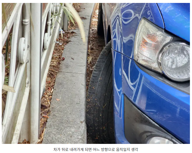 1번과는 다르게 스티어링 휠을 반대 방향을 돌려보는건 어떨까 싶었습니다. 정석적인 것은 1번이 분명한 것은 맞지만 저는 내리막을 등지고 주차했을 때는 이 방법도 충분히 가능하고, 어쩌면 휠 손상없이 타이어만으로 위험을 방지할 수 있는 방법이 될 수도 있다고 생각합니다.