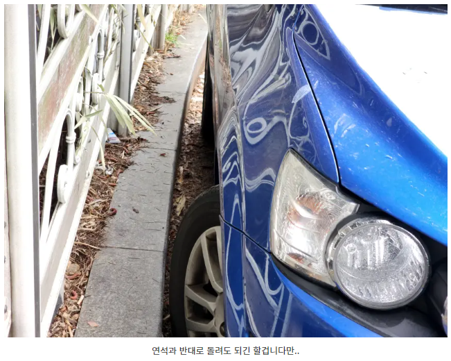 오르막길이지만 이렇게 주차를 해두면 차량이 뒤로 움직이게 될 때 뒷타이어가 연석과 맞닿게 되므로 차량이 정지할 수 있게 되는 것이죠.