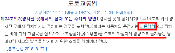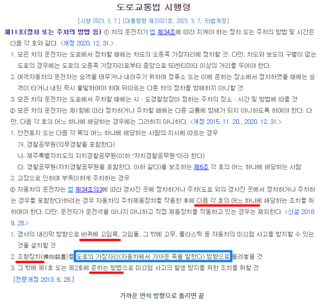도로교통법 제34조의3 경사진 곳에서의 정차 또는 주차의 방법에 보면 운전자는 대통령령으로 정하는 방법으로 올바르게 주차를 하라고 나와 있습니다. 그렇다면 자세한 방법은 시행령을 봐야겠군요.