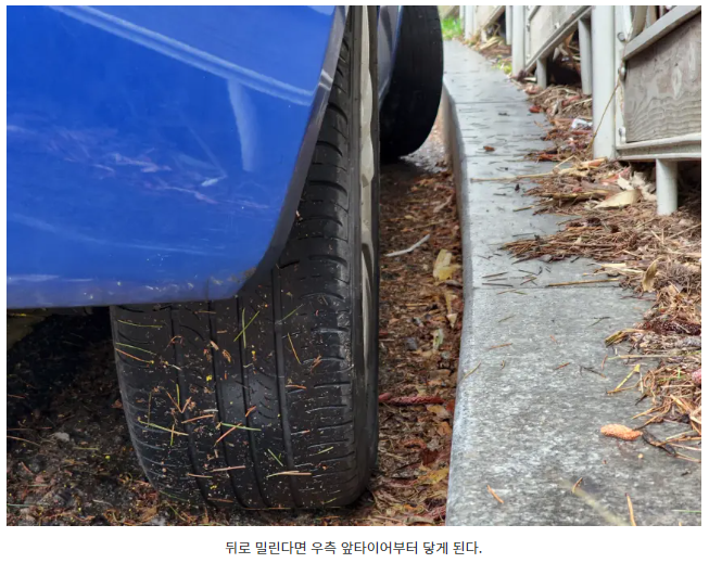 다만 주차를 할 때 반드시 후진 주차를 해야하고 연석에 차량을 최대한 밀착시킬 수 있는 주차 실력이 뒷받침 되어야 합니다. 사진으로 예를 들어보면 아래와 같습니다. 조향장치를 우측으로 돌려놨기 때문에 혹시나 차량이 뒤로 밀려 내려간다면 가장 먼저 동승석 앞타이어가 연석에 닿게 되겠죠.
